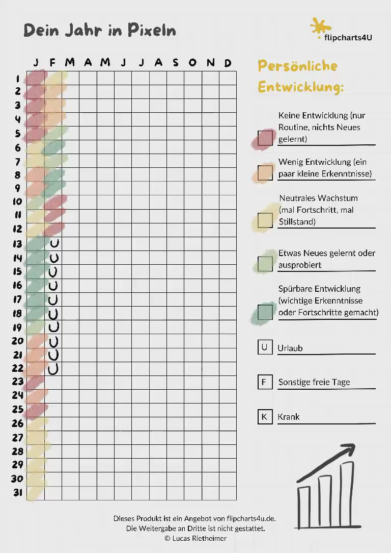 Das Jahr in Pixeln ist ein effektives Tool zur visuellen Selbstreflexion, mit dem du deine Erlebnisse und Entwicklungen über das Jahr hinweg festhalten kannst. Durch eine Kalenderdarstellung, in der jeder Tag als Quadrat eingefärbt wird, kannst du schnell erkennen, wie sich verschiedene Lebensbereiche wie Gesundheit, Arbeit und persönliche Entwicklung verändert haben. Mit der Wahl von Farben lässt sich dein Fortschritt oder Verbesserungspotential auf einen Blick erfassen. Ideal für die persönliche Nutzung und als interaktives Tool für Workshops oder Team-Reflexionen.