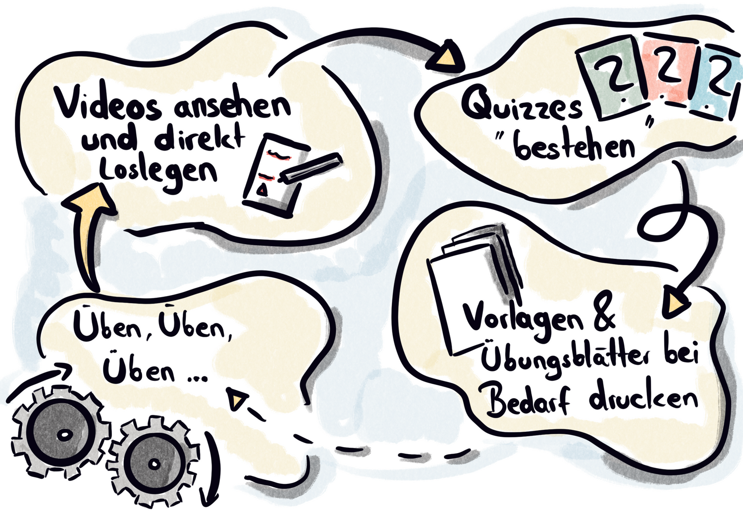 In diesem ca. 2-stündigen Online-Kurs erfährst du alles, was du wissen musst, um mit Sketchnoting-Techniken effektive und ansprechende Flipcharts zu gestalten. Perfekt für alle, die in Meetings oder Workshops visuell überzeugen möchten. Der Kurs ist komplett asynchron aufgebaut, sodass du alle Inhalte flexibel und unabhängig von festen Zeiten bearbeiten kannst.